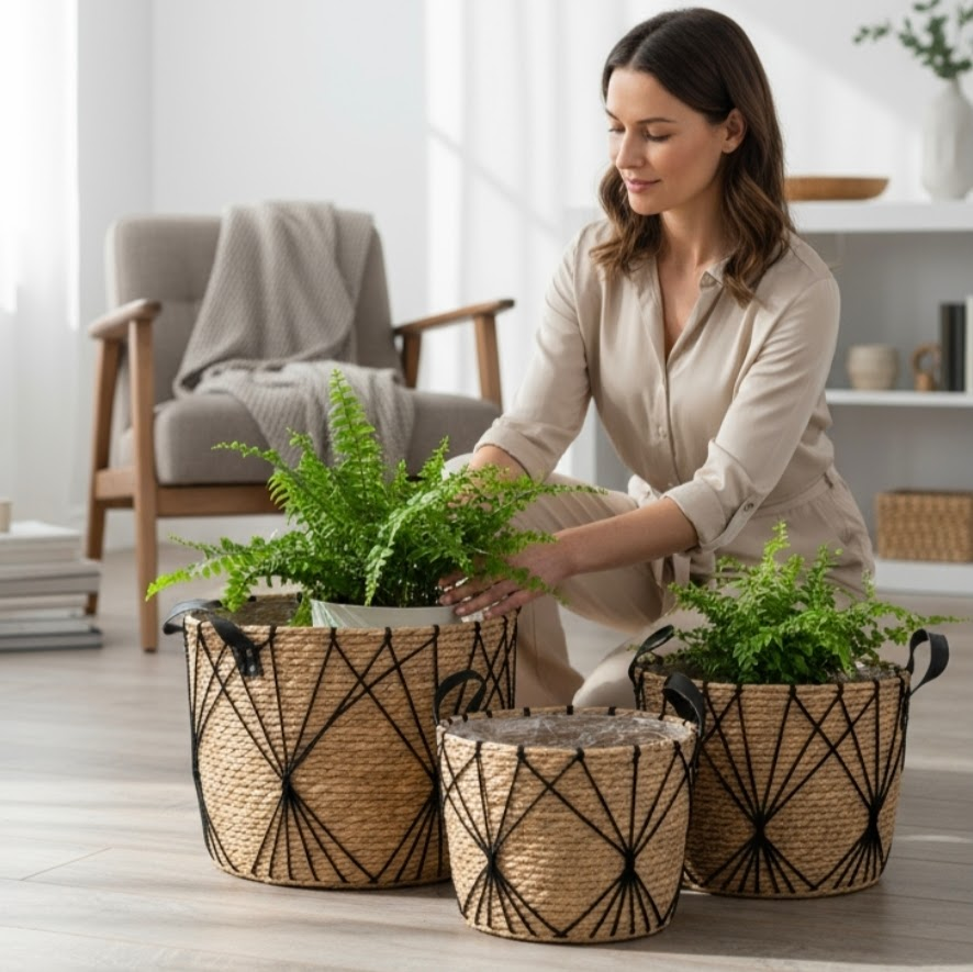 canastos de fibra vegetal con asa del cuero y diseño en hilo de algodón tejido protector plastico. medidas: