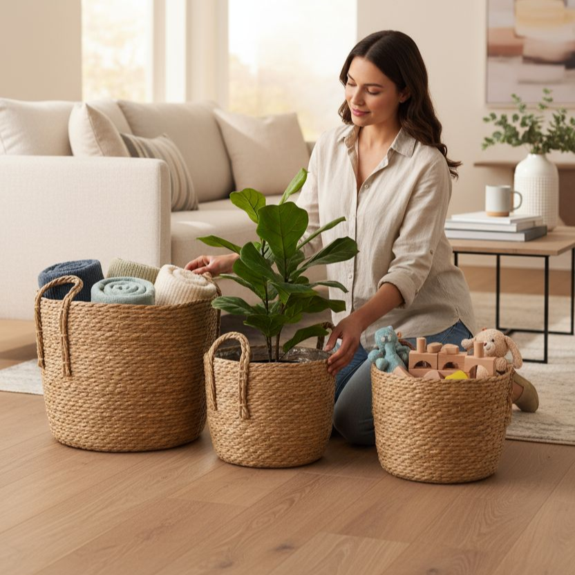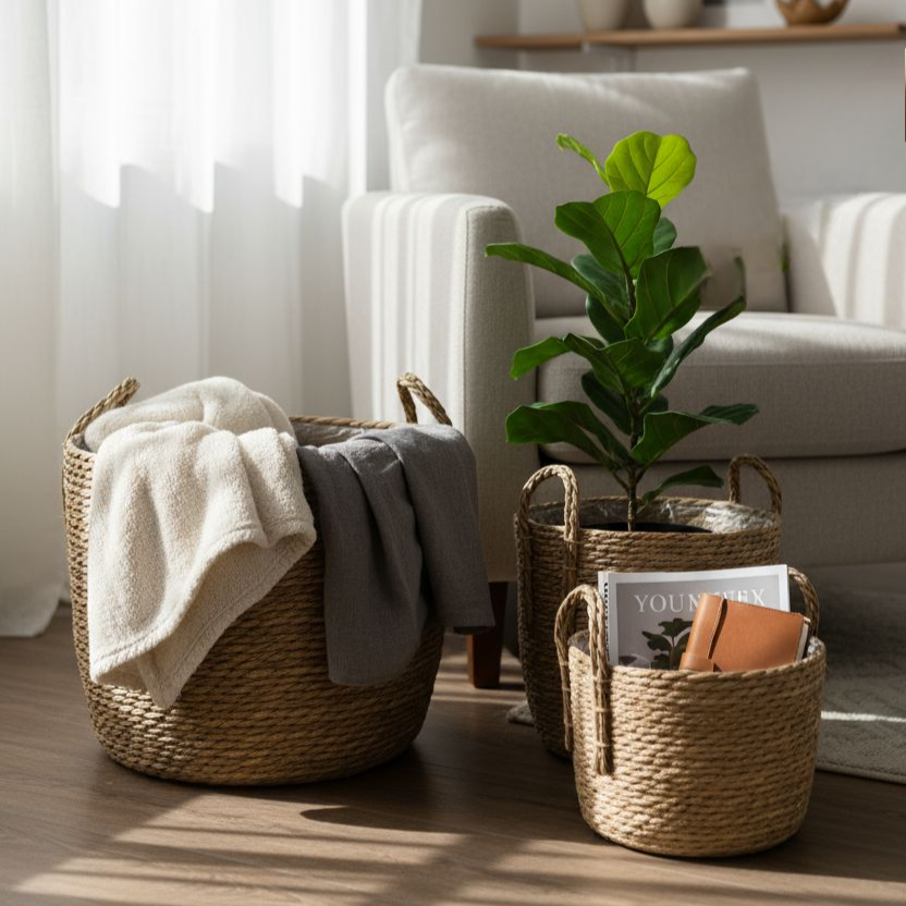 Canastos de fibra vegetal con protector interno en plástico. ideal para prologar la ida util del canasto. medidas: 35 x 28,5cm 30x27cm 25 x 20 cm.